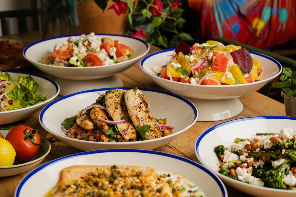 The heart of the menu sees healthy, satisfying proteins like Baked Salmon served with tzatziki or Chicken Kalamaki served on a bed of sautéed chickpeas, before indulging in a choice of desserts from a Lemon Semolina Pistachio Cake or Choc Chunk Cookie making for a lunch worthy of the gods.
