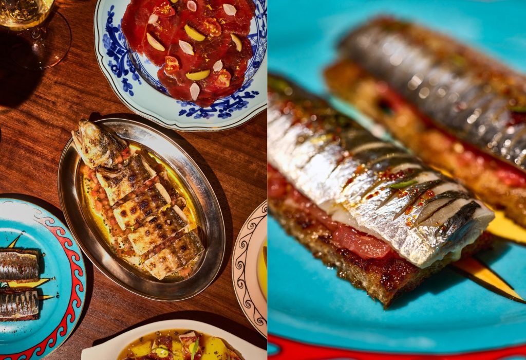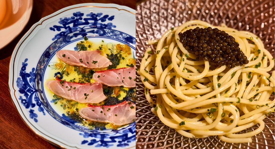 A selection of three elegantly prepared raw dishes is recommended, such as Bluefin Tuna Carpaccio that melts on the tongue, brushed with Calabrian chilli oil and dressed with confit tomatoes and Andalusian olives; fatty, delicate Kinmedai served with preserved Meyer lemon and mango vinegar; and a charred Shima-Aji with salsa verde and Taggiasca olives, dressed with Japanese river fish sauce for extra umami.