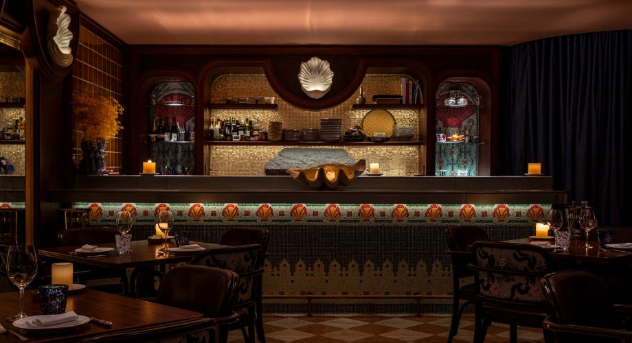 Guests enter the Salon on Bridges Street and immediately discover the intimate dining room designed in blue and turquoise seaside tones by Melissa Collison. The space is warmly candlelit, with dark wooden tables, plush velvet banquettes and an array of seaside touches, from clamshell wall sconces and decor pulled from the deep.