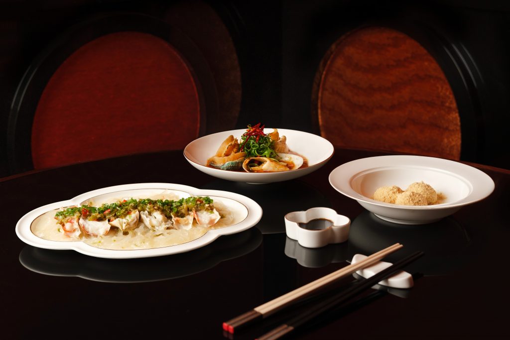 With a focus on the abundant seasonal produce of the region, enjoy new dishes, including Jiu Xiang Ma La Liang Ban Hai Xian, fragrant and numbing assortment of seafood including abalone, clams and the briny, sweet flavour of whelks. The centrepiece of every Mid-Autumn feast is the Shao Jiao Di Wang Xie, a steamed Japanese king crab served with Sichuan-style scorched green chillies resting on a bed of mung bean jelly noodles (must be pre-ordered 48-hours in advance). It is believed that the full moon is when crabs are most well-fed and plump, and this simple dish showcases the sweet flavour of the meat balanced by the smokiness of the sauce. To end the meal, Chef Theign introduces San Da Pao glutinous rice balls coated with soybean flour and finished with black sugar syrup.