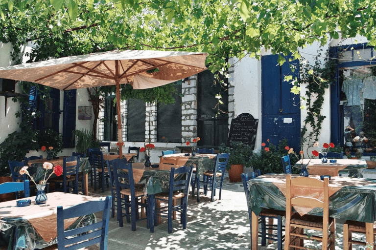 Sitting in a vine-shaded courtyard bathed in dappled sunlight, your view of the glistening Mediterranean all jutting cliffs and tree-covered mountains. Colourful plates on paper tablecloths, pinned in...