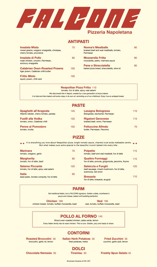 FALCONE is an all-day pizzeria Napoletana that celebrates what we love most about Italy: Neapolitan pizza, handcrafted pasta, and traditional, freshly churned gelato.