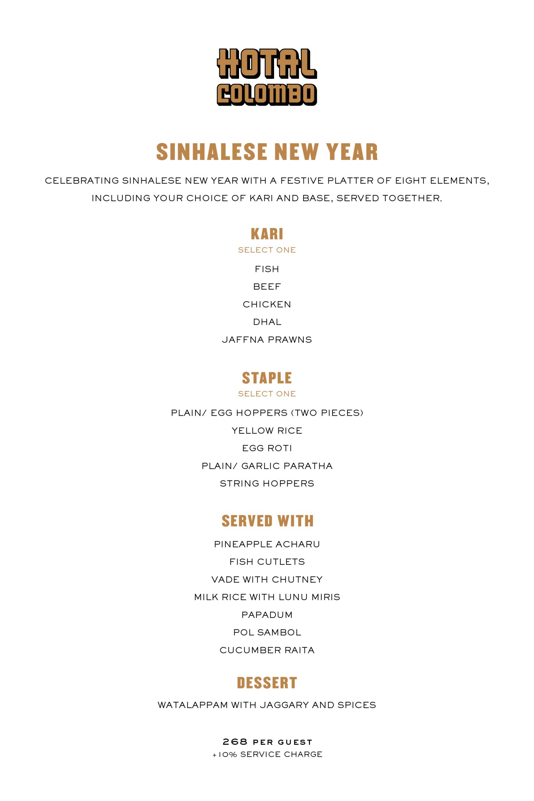 To mark Sinhalese New Year, Chef Gizzy presents a festive thali designed as a complete meal in one. Centred around your choice of kari and base — from rice, hoppers or roti — the platter brings together eight elements, each prepared to be enjoyed in combination rather than on their own.